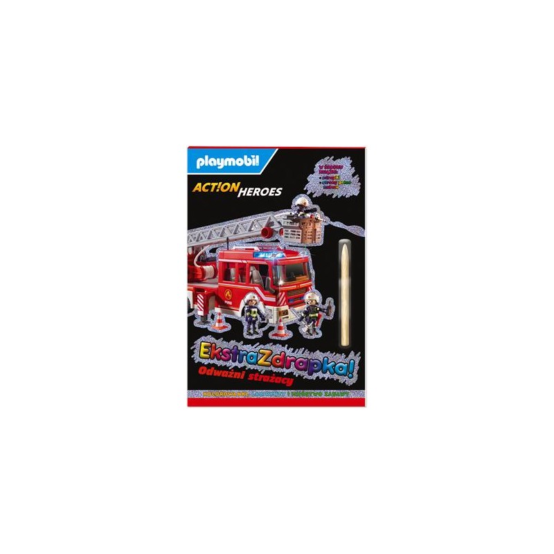 Playmobil Action Heroes. Ekstrazdrapka to atrakcyjna książka wspomagająca zdolności manualne u dzieci. Zawiera kolorowanki, labirynty, kolorowe strony do zdrapywania oraz rysik. Wystarczy rysikiem zdrapać farbę, aby pojawiły się błyszczące obrazki lub wielobarwne ilustracje z dynamicznym życiem miasta oraz bohaterską pracą miejskich służb ratunkowych.