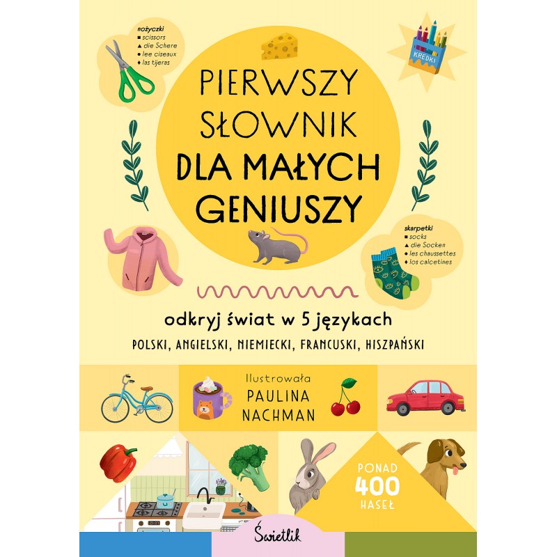 „Pierwszy słownik dla małych geniuszy. Odkryj świat w 5 językach” to idealna propozycja dla dzieci w wieku od 6 do 8 lat, które uwielbiają odkrywać otaczający je świat i chcą zacząć naukę języków obcych. Książka sprawdzi się jako prezent z okazji urodzin lub nagroda książkowa na zakończenie roku szkolnego.