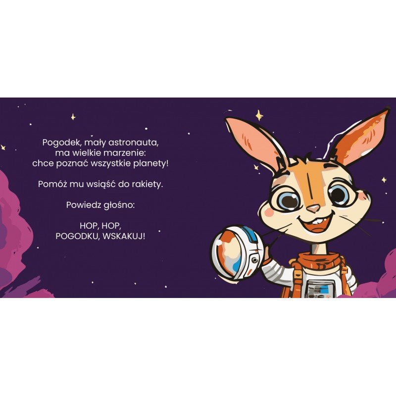 „Pogodek i tajemnice kosmosu” to interaktywna książeczka dla najmłodszych, która zabiera dzieci w niezwykłą podróż po Układzie Słonecznym. Razem z Pogodkiem mali czytelnicy poznają planety, uczą się, czym różni się Ziemia od Marsa czy Saturna i odkrywają sekrety kosmosu – a wszystko w formie pełnej zabawy i działania.