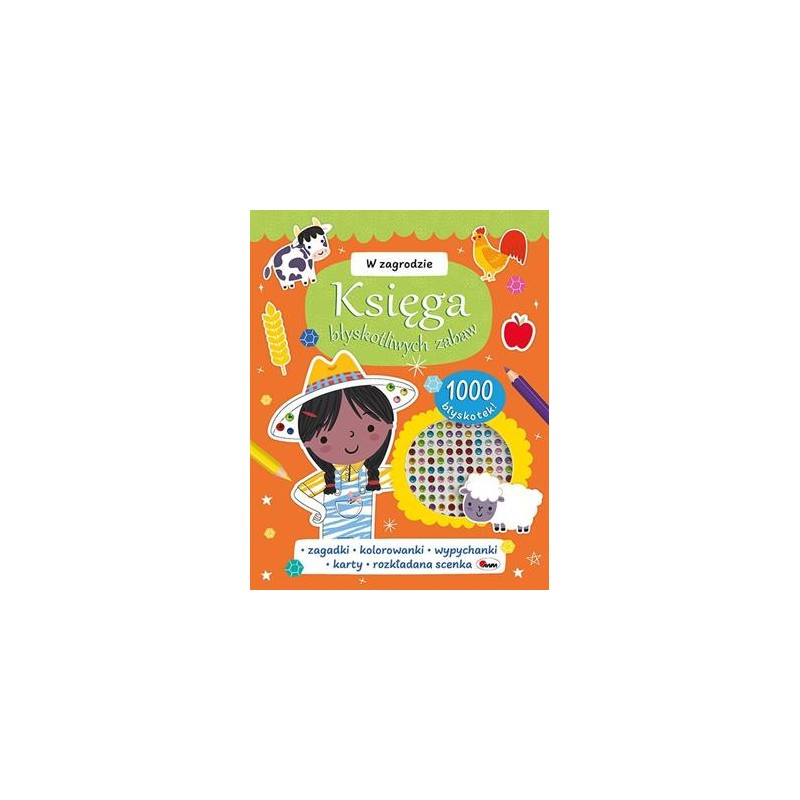 KSIĄŻECZKA Z ZABAWAMI EDUKACYJNYMI dla dzieci w wieku przedszkolnym. CIEKAWE ZADANIA I ZABAWY doskonalą wiele umiejętności. NAKLEJKI z postaciami oraz ponad 1000 KOLOROWYCH BŁYSKOTEK do wykorzystania w książce i do zabawy. W środku WYPYCHANKI i GRY oraz rozkładana SCENKA. Wesołe ilustracje i przyjaźni bohaterowie zachęcają do NAUKI i ZABAWY. Dzięki ODPOWIEDNIO DOBRANYM i ZRÓŻNICOWANYM ZADANIOM dzieci mogą ćwiczyć wiele kompetencji, świetnie się przy tym bawiąc. Książka w przyjaznej dla przedszkolaków formie proponuje trening takich aktywności, jak: SZUKANIE RÓŻNIC, LABIRYNTY, KOLOROWANIE, RYSOWANIE PO ŚLADZIE, ŁĄCZENIE KROPEK, LICZENIE oraz PRZYKLEJANIE NAKLEJEK i SKŁADANIE SCENEK. Książka wzbogaca ZASÓB SŁOWNICTWA, utrwala WIADOMOŚCI I UMIEJĘTNOŚCI, poszerza WIEDZĘ, ćwiczy SPOSTRZEGAWCZOŚĆ, doskonali KOORDYNACJĘ WZROKOWO-RUCHOWĄ. Do nauki zachęcają zwierzęta z wiejskiej zagrody – koniki, krówki, świnki i wiele innych.
