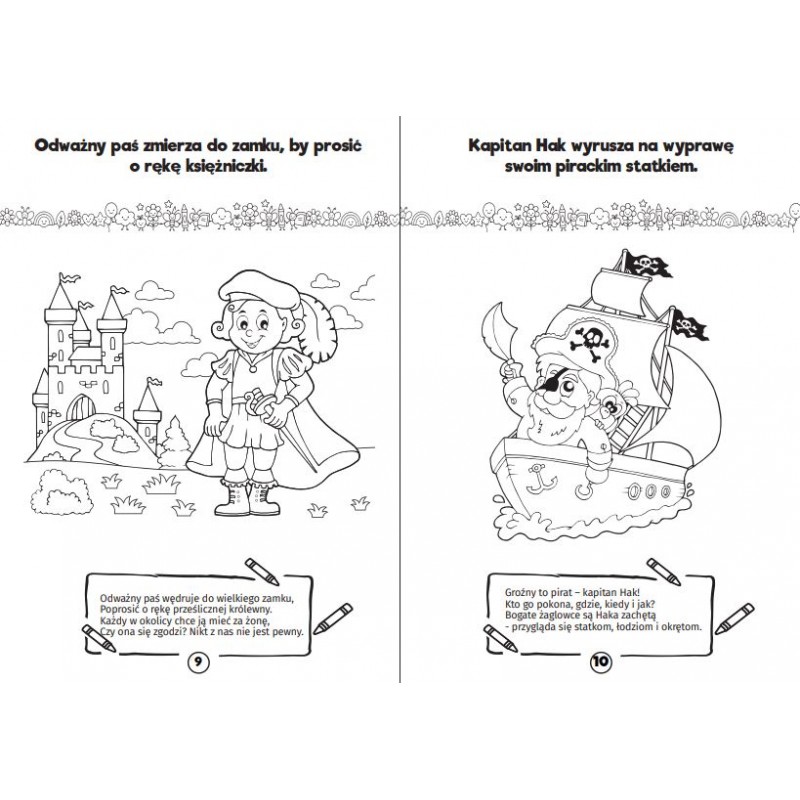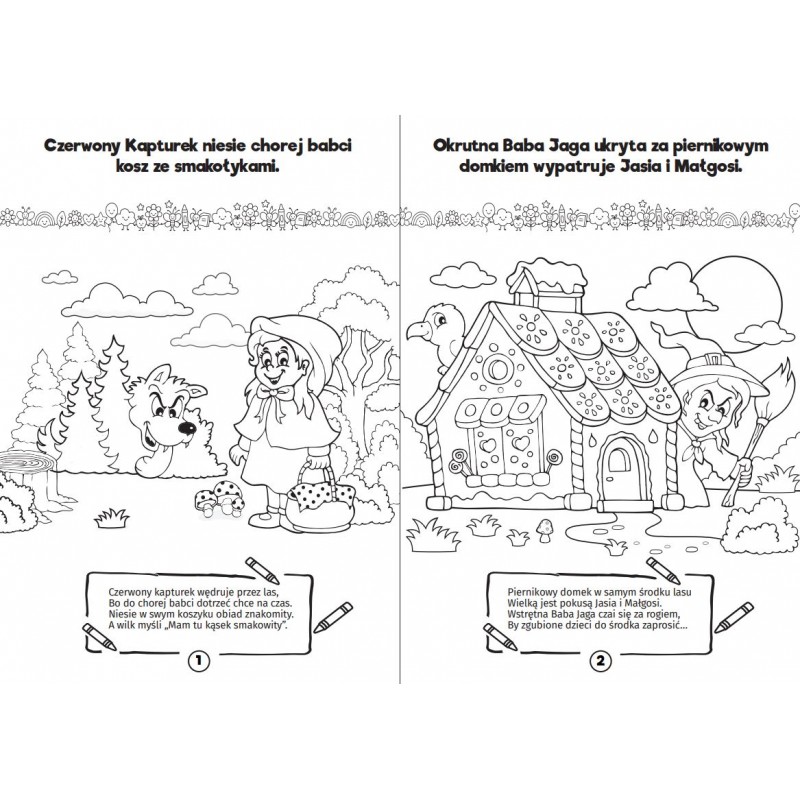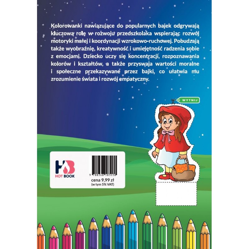 Kolorowanka edukacyjna związana tematycznie z bajkami to nie tylko zabawa – to narzędzie wspierające rozwój emocjonalny, poznawczy i społeczny przedszkolaka. Tego typu rodzaj zajęć buduje więź z literaturą i światem opowieści. Choć nie wszystkie obrazki do pokolorowania nawiązują wprost do znanych i popularnych bajek to wszystkie wpisują się w bajkowy klimat. Dodatkowy element edukacyjny tworzą opisy w postaci krótkiej historii umieszonej pod obrazkiem. Na wewnętrznej stronie okładki został umieszczony list, którego treść jest skierowana do rodziców i nauczyli przedszkoli. Zostały w nim przypomniane korzyści płynące z kolorowania. Na ostatniej stronie w sekcji DIY została umieszczona do wycięcia postać Czerwonego Kapturka. W każdej kolorowance z tej serii będzie inny bohater bajkowy do wycięcia, tak aby można było stworzyć ich kolekcję.
