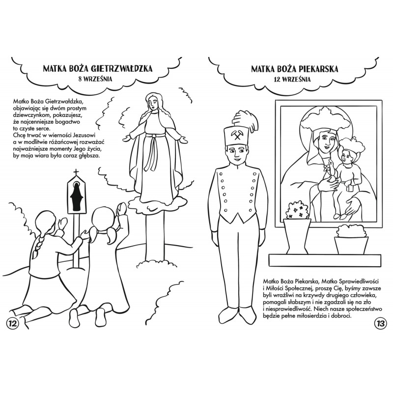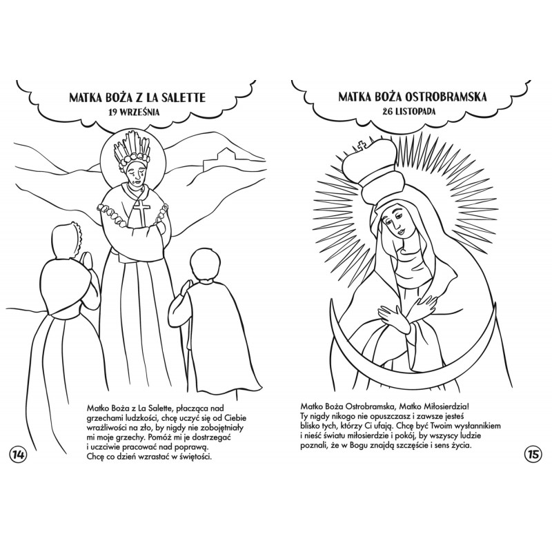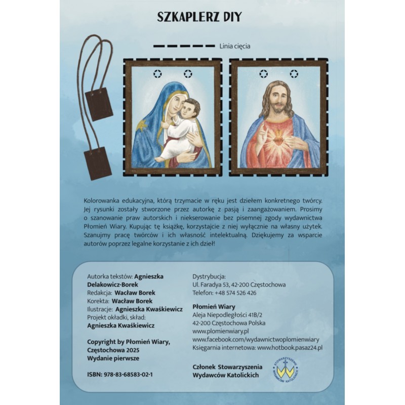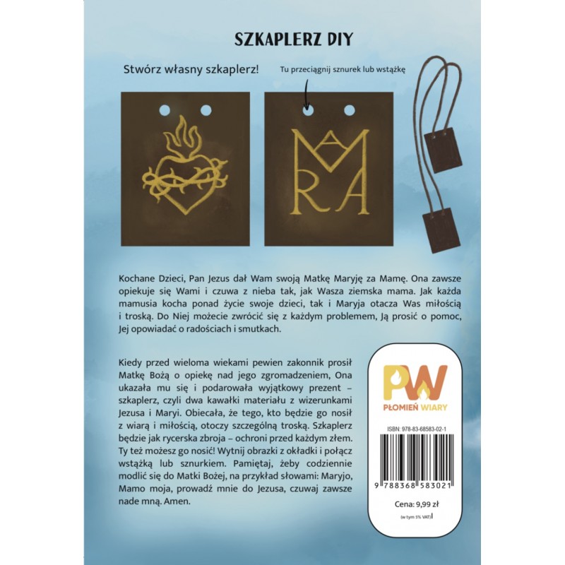 Kiedy przed wieloma wiekami pewien zakonnik prosił Matkę Bożą o opiekę nad jego zgromadzeniem, Ona ukazała mu się i podarowała wyjątkowy prezent – szkalpierz, czyli dwa kawałki materiału z wizerunkami Jezusa i Maryi. Obiecała, że tego, kto będzie go nosił z wiarą i miłością, otoczy szczególną troską. Szkalplerz będzie jak rycerska zbroja – ochroni go przed każdym złem. Ty też możesz go nosić! Wytnij obrazki z okładki i połącz wstążką lub sznurkiem. Pamiętaj, żeby codziennie modlić się do Matki Bożej, na przykład słowami: Maryjo, Mamo moja, prowadź mnie do Jezusa, czuwaj zawsze nade mną. Amen.