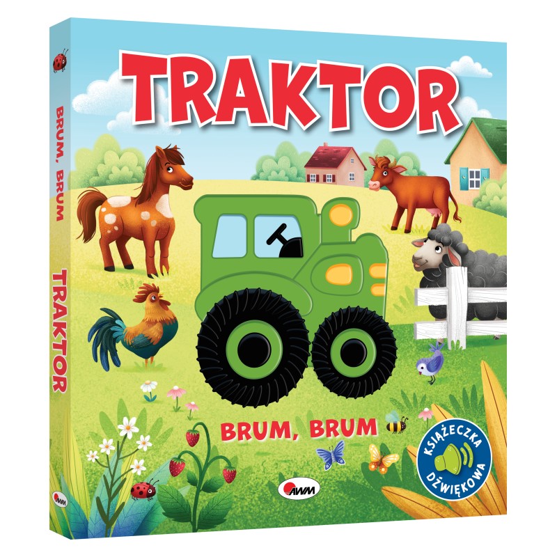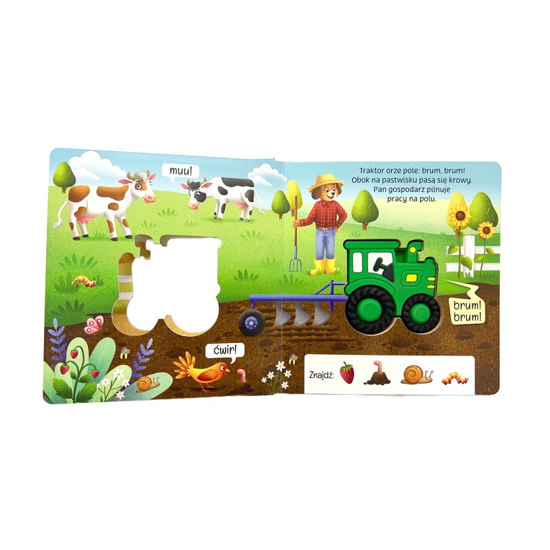 Książka zawiera elementy dźwiękowe – silikonowy moduł dźwiękowy w kształcie pojazdu, prezentujący 5 realistycznych dźwięków traktora. Dzięki temu dziecko może usłyszeć, jakie odgłosy wydają poszczególne części maszyny, co doskonale rozwija zmysł słuchu. Barwne ilustracje o żywej kolorystyce stymulują zmysł wzroku, a interaktywny element zachęca do poznawania świata przez dotyk.