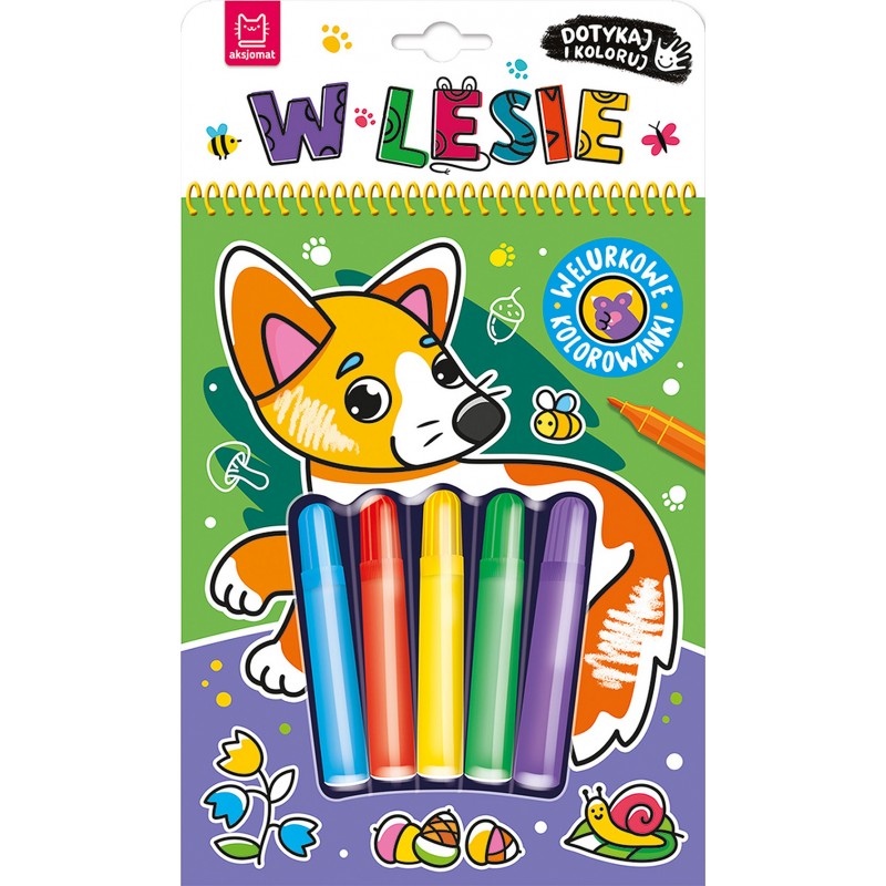 „Dotykaj i koloruj. W lesie” to kolorowanka sensoryczna z dołączonymi pisakami. Tło obrazków pokrywa czarny welur, który podkreśla głębię kolorów, zapewnia wrażenia sensoryczne i ogranicza wychodzenie poza linię. Małych fanów i fanki zwierząt czeka spotkanie z mieszkańcami lasu. W gronie leśnych zwierząt w książce znajdują się: borsuk, dzik i sowa, bobry, niedźwiedź, jeleń, wilk i nietoperze, wiewiórki, zajączek. Dzieci nie tylko pokolorują 8 uroczych rysunków. Przeczytają również wierszyki o zwierzętach z ilustracji. A dzięki perforacji pokolorowaną pracę mogą oderwać, włożyć do ramki i podarować w prezencie lub ozdobić nią pokój.