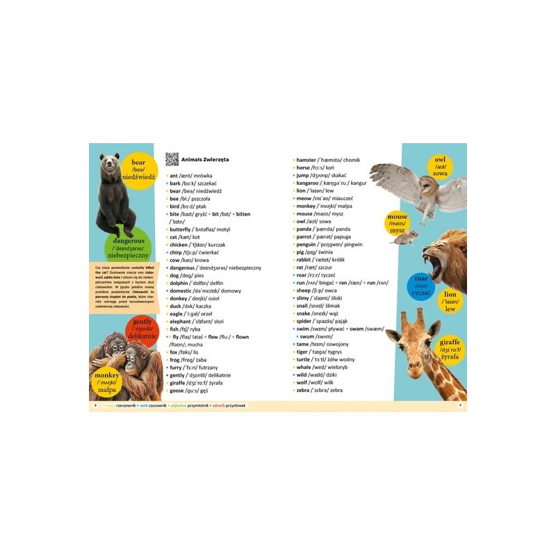 • pierwsza to angielsko-polski słownik tematyczny, w którym dziecko może szybko znaleźć słowa związane z konkretnym tematem, na przykład ze zwierzętami; przy każdym temacie znajduje się kod QR, który po zeskanowaniu go odsyła ucznia do strony z nagraniami wymowy słówek