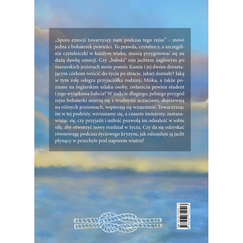 „Sporo emocji towarzyszy nam podczas tego rejsu” – mówi jedna z bohaterek powieści. To prawda, czytelników czeka duża dawka emocji. Czy „babski” rejs jachtem żaglowym w malowniczej scenerii mazurskich jezior może pomóc Kamie i jej dwóm dorastającym córkom wrócić do życia po stracie, jakiej doznały? Jaką w tym rolę odegra przyjaciółka rodziny, Miśka, a jaką poznane na żeglarskim szlaku osoby, zwłaszcza pewien student i jego wyjątkowa babcia? Pełen przygód rejs jest też podróżą w głąb siebie, podczas której trzeba zmierzyć się z trudnymi uczuciami. Czy wzajemne wsparcie, przyjaźń i miłość pomogą im odnaleźć w sobie siłę i przejść wewnętrzną przemianę?