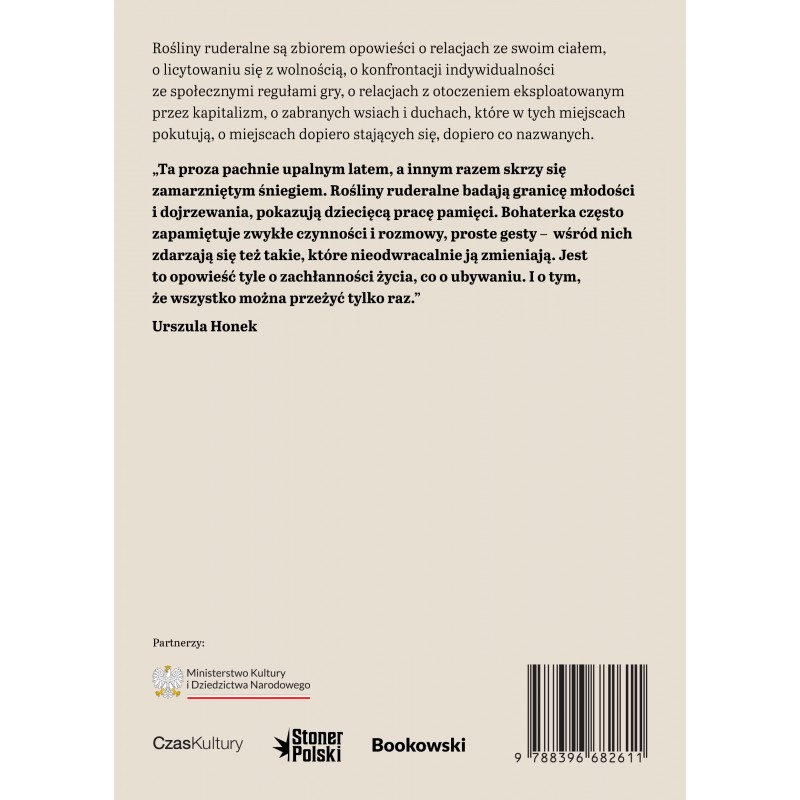 „Rośliny ruderalne” są zbiorem opowieści o relacjach ze swoim ciałem, o licytowaniu się z wolnością, o konfrontacji indywidualności ze społecznymi regułami gry, o relacjach z otoczeniem eksploatowanym przez kapitalizm, o zabranych wsiach i duchach, które w tych miejscach pokutują, o miejscach dopiero stających się, dopiero co nazwanych.