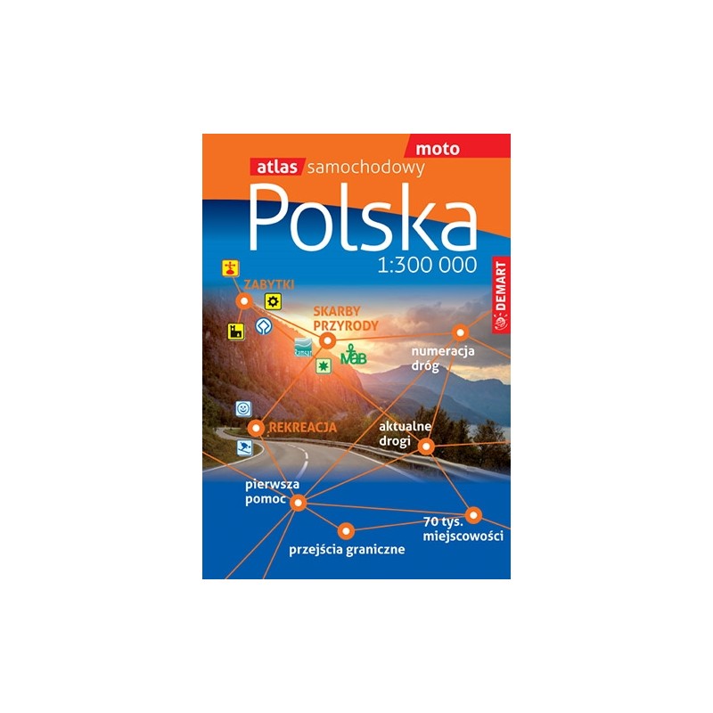 Atlas samochodowy. Polska 1 : 300 000 znakomicie łączy na mapie aktualne informacje drogowe z lokalizacją i opisem miejsc i obiektów zabytkowych, rekreacyjnych oraz ze wskazaniem najcenniejszych dóbr kultury i natury. Podstawowa mapa przeznaczona jest nie tylko dla kierowców, ale i dla turystów, którzy podróżują po Polsce i lubią odkrywać nowe miejsca. Jego najważniejsze atuty atlasu to:
