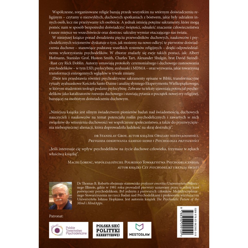 W niniejszej książce ponad dwudziestu pięciu przewodników duchowych, naukowców i psychodelicznych wizjonerów dyskutuje o tym, jak możemy na nowo odkryć te pierwotne doświadczenia duchowe – stanowiące podstawę wszelkich systemów religijnych – dzięki odpowiedzialnemu wykorzystaniu psychodelików. W zbiorze znalazły się eseje takich postaci, jak: Albert Hofmann, Stanislav Grof, Huston Smith, Charles Tart, Alexander Shulgin, brat David Steindl-Rast czy Rick Doblin. Autorzy omawiają protokoły ceremonialnego i duchowego zastosowania psychodelików – w tym LSD, psylocybiny, ayahuaski i MDMA – oraz wyzwania, jakie towarzyszą transformacji enteogennych wglądów w trwałe zmiany.