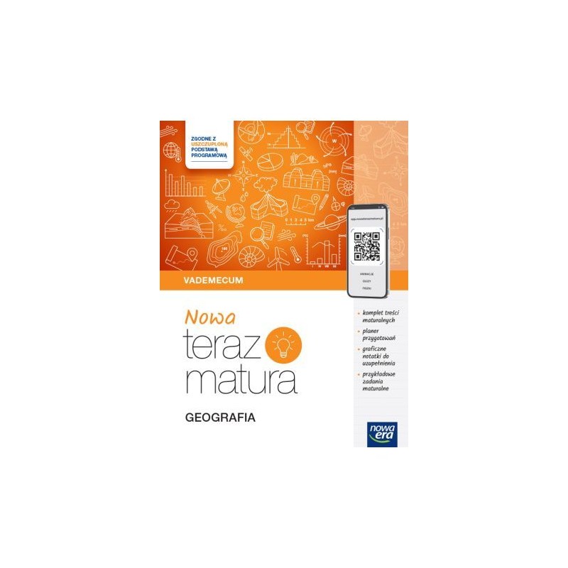 planer – plan przygotowań do matury z poręczną checklistą zagadnień przedmiotowych cała wymagana teoria w jednym miejscu i w optymalnie skondensowanej postać i dostęp do materiałów cyfrowych ułatwiających powtarzanie teorii, m.in.: fiszek, quizów, animacji procesów i galerii zdjęć graficzne notatki do uzupełnienia usprawniające proces powtarzania i zapamiętywania materiału samouczki z kluczowymi umiejętnościami geograficznymi zadania maturalne po działach, rozwiązane krok po kroku oraz do samodzielnego rozwiązania oznaczenie zagadnień najczęściej występujących na maturze rozkładana wklejka na końcu publikacji z dużymi mapami politycznymi i mapami fizycznymi świata oraz Europy Nowa Teraz matura. I wiesz jak zdać nową maturę.