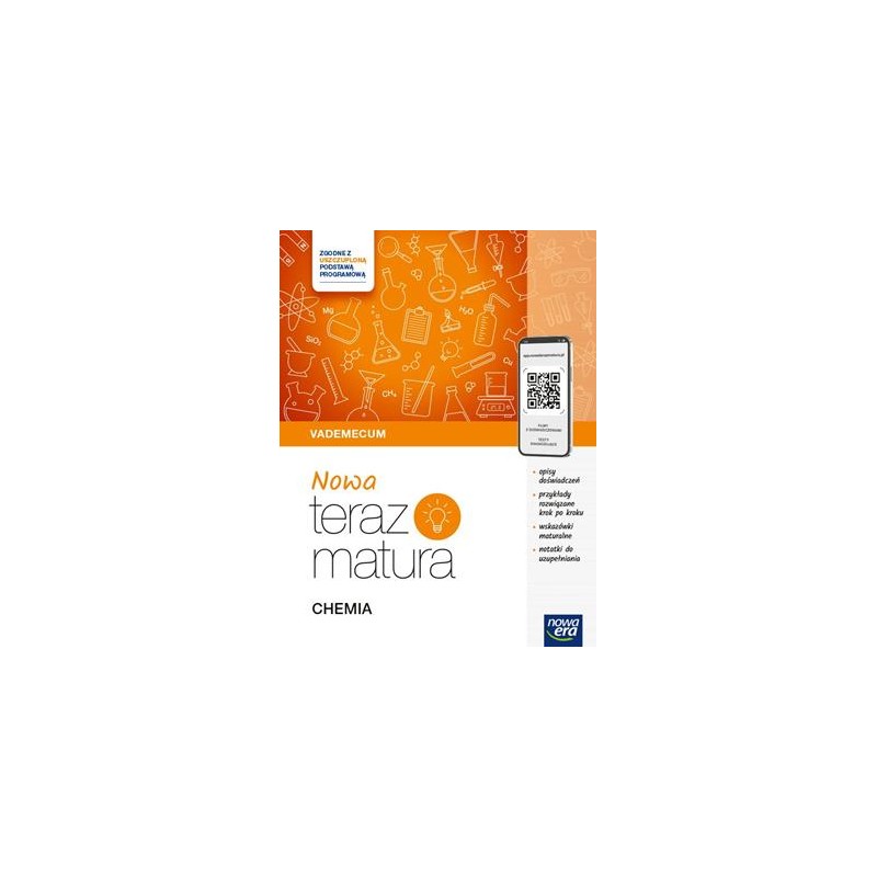 Vademecum „NOWA Teraz matura. Chemia” pozwala uporządkować i powtórzyć treści przed egzaminem. Jest w pełni skorelowane ze Zbiorem zadań maturalnych „NOWA Teraz matura. Chemia. Część 1. i 2.” i zawiera kody dostępu do dodatkowych materiałów na app.nowaterazmatura.pl.