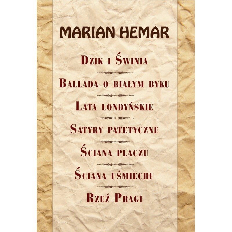 Na niniejszy tom składa się siedem wydanych pierwotnie osobno tomików poetyckich Mariana Hemara: „Dzik i Świnia” (Lwów 1922), „Ballada o białym byku” (Lwów, 1923), „Lata londyńskie” (Londyn 1946), „Satyry patetyczne” (Londyn 1947), „Ściana płaczu” (Londyn 1968), „Ściana uśmiechu” (Londyn 1968) oraz „Rzeź Pragi” (Londyn 1968). Zostały one przygotowane przez samego autora i opublikowane za jego życia, dlatego zbiór, który trzymają Państwo w dłoniach, zachowuje ich kolejność chronologiczną oraz oryginalny układ utworów w obrębie każdego z tomików. Są one przecież ważnym punktem w twórczości jednego z najbardziej znanych i lubianych poetów polskich XX wieku.