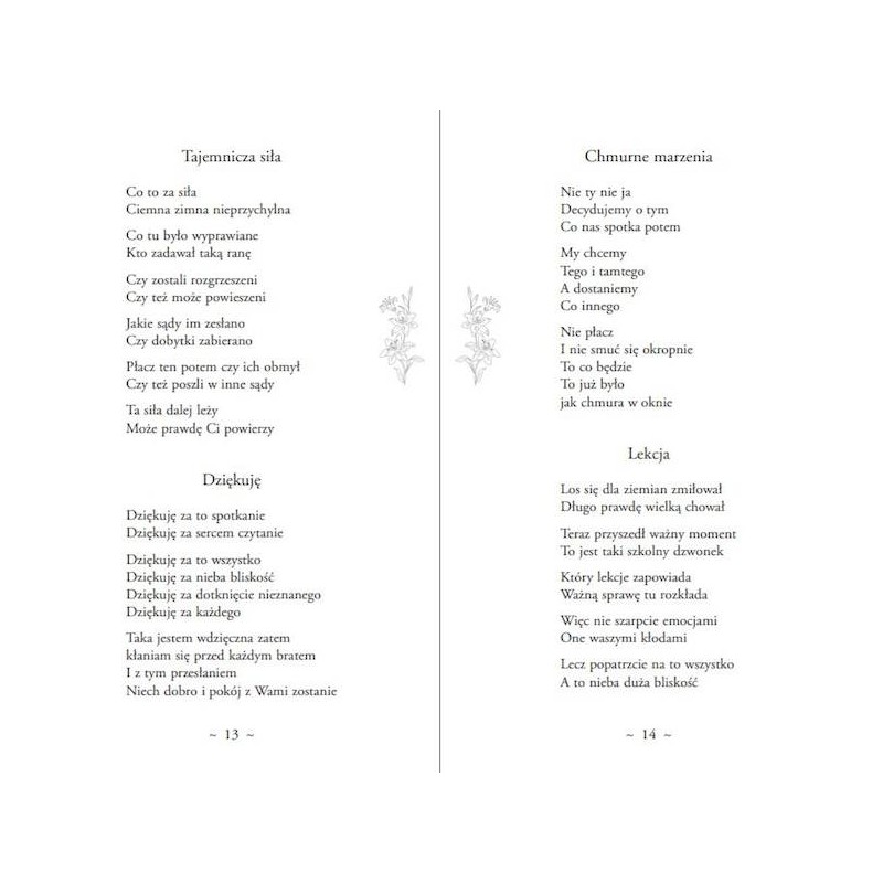 Pani Alicja pisze jednak wiersze w niezwykły sposób. Przez wiele lat zajmowała się niesłyszącymi a dzisiaj sama doświadcza braku innego zmysłu, zmysłu wzroku. Jest osobą niewidzącą. Zapisuje więc swoje wiersze w myślach. Recytuje z pamięci. Nie jest to jednak największy fenomen Poetki. Nie będąc teologiem, prostymi, bardzo skondensowanymi słowami tłumaczy ważne zagadnienia wiary, miłości i nadziei.